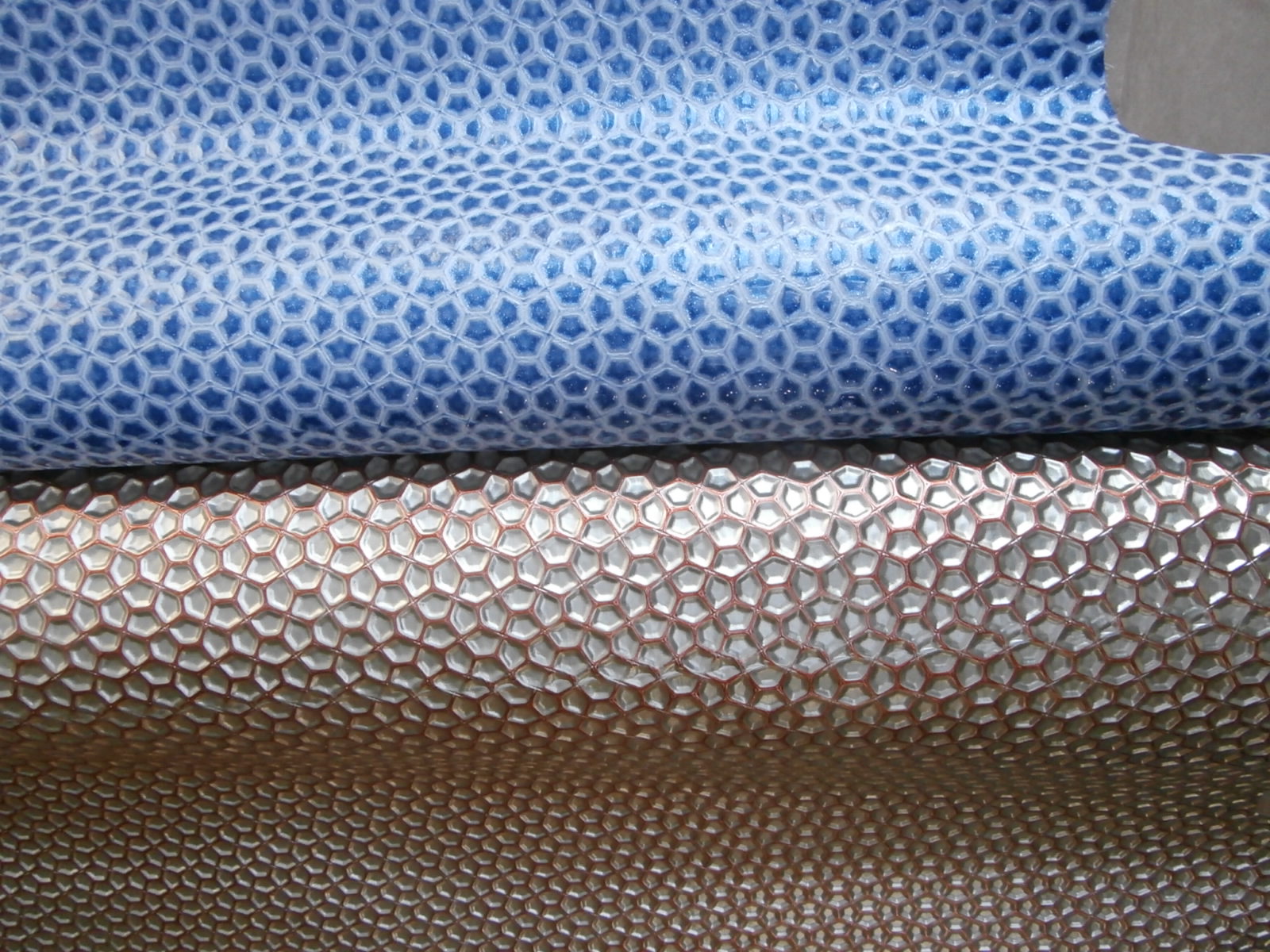 革の凹凸の凸の部分 ( 頭 ) に、手作業で染料顔料などで色をつけたり