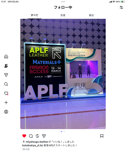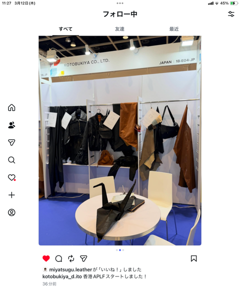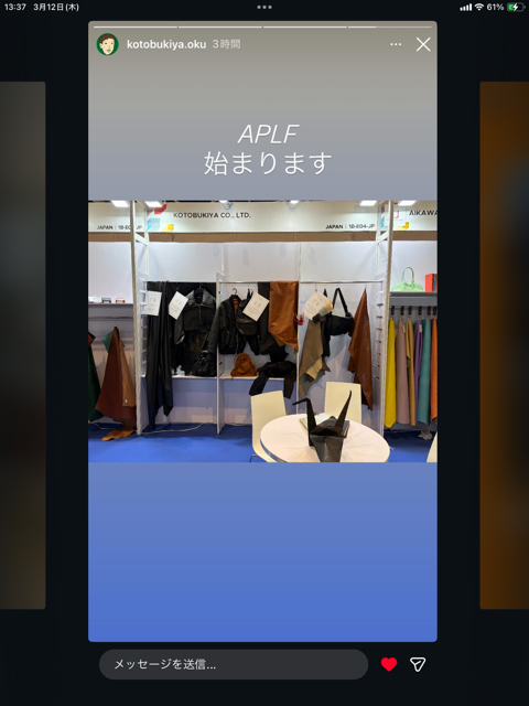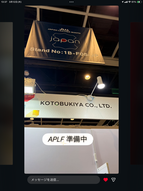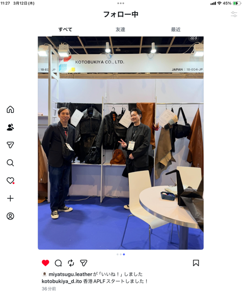 ALPF 香港レザーフェア出展 香港にて 本日3/12(木)~3/14(土)まで 「APLF LEATHER HONG KONG 2026 」開催中 弊社 株式会社 寿屋も初出展しております。 ( 大阪の奥と、東京の伊東が参戦 ) 「オリガミ」 「KARUI」 「エアータンニン」他 人気の商品を展示しております。 Tags: APLF LEATHER, KARUI, エアータンニン, オリガミ, スマホケース, スムース, バッグ, バッグ、小物, レザー, レザークラフト, 国産レザー, 大国町 革屋, 寿屋, 牛革, 皮革, 皮革 卸売, 財布, 革, 香港レザーフェア Categorised in: イベントのお知らせ, ニュース全ての記事 ニュース一覧に戻る
